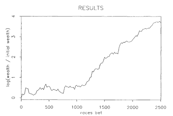 话说William大哥在香港靠模型赌马赢了不少钱之后,不忘自己一个学者的本份,把自己的模型系统写成了一个报告,就是上面这篇。这篇报告发表在1994年,后来还有很多的学者在此基础之上开发新的、更为炫酷的模型,但不得不说,William的这篇可以说是真正意义上的开山之作。 这里先给大家展示一下William模型的盈利效果(纵轴是取了Log的哦):